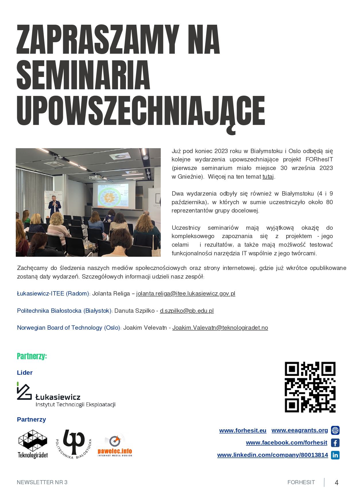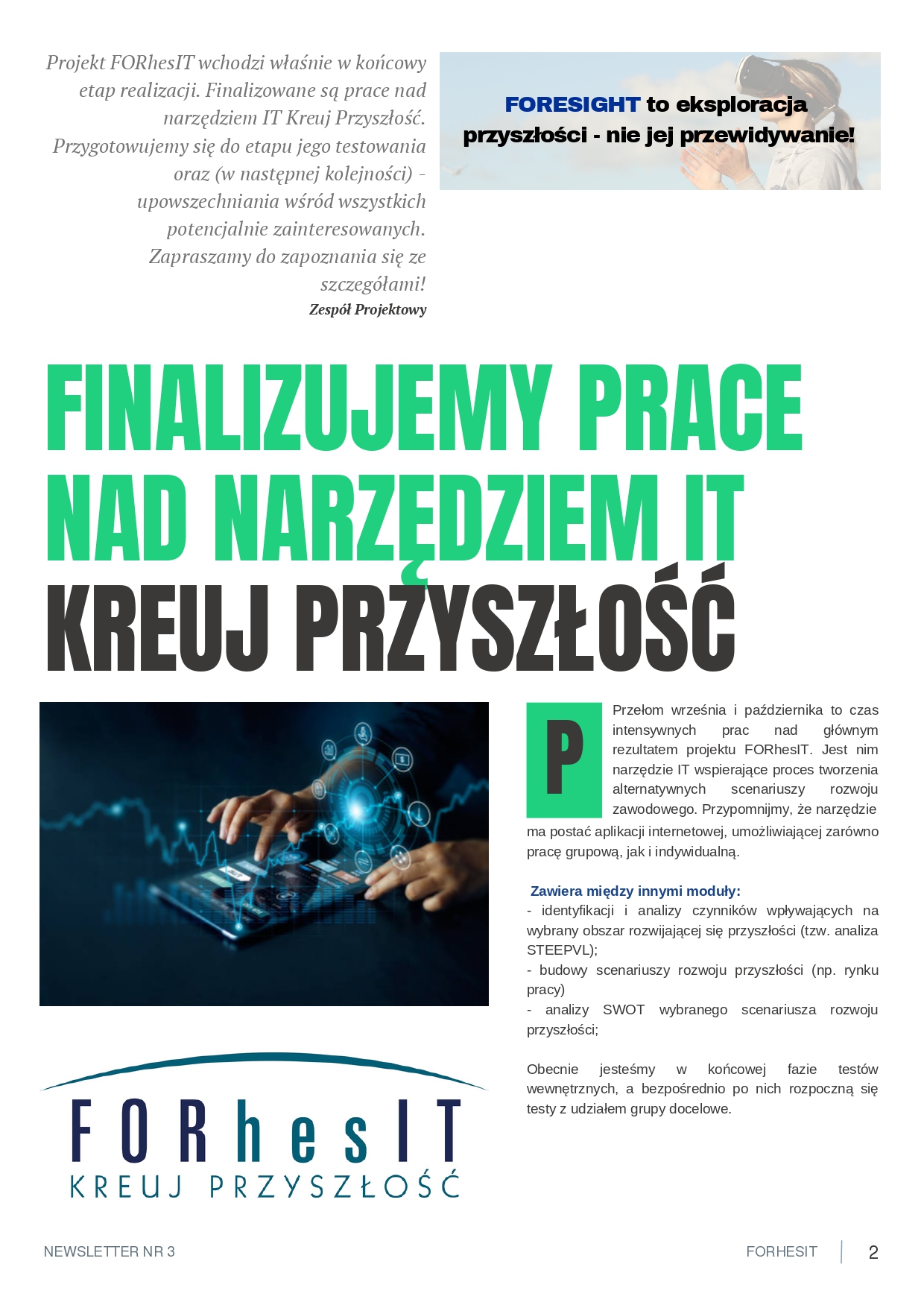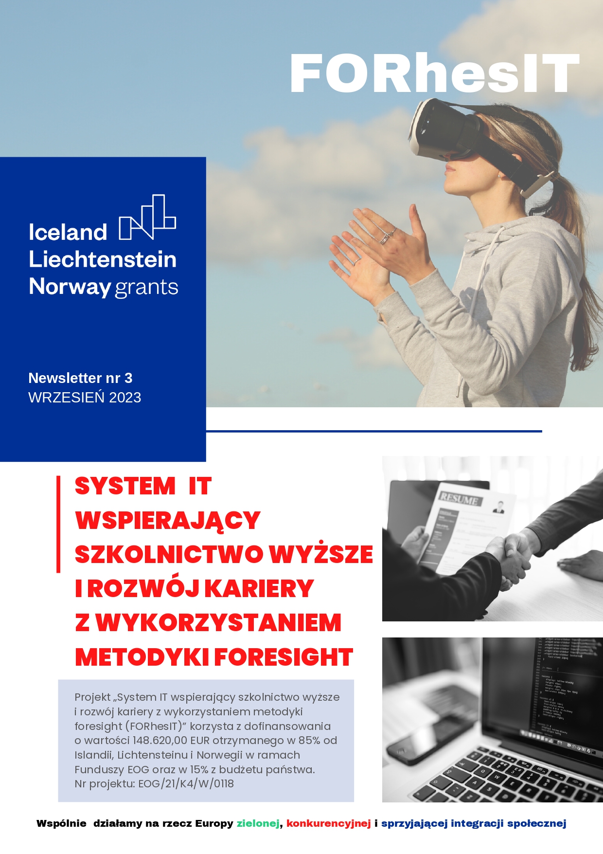 Projekt „System IT wspierający szkolnictwo wyższe i rozwój kariery z wykorzystaniem metodyki foresight (FORhesIT)” korzysta z dofinansowania o wartości 148.620,00 EUR otrzymanego w 85% od Islandii, Lichtensteinu i Norwegii w ramach Funduszy EOG oraz w 15% z budżetu państwa (nr projektu: EOG/21/K4/W/0118).